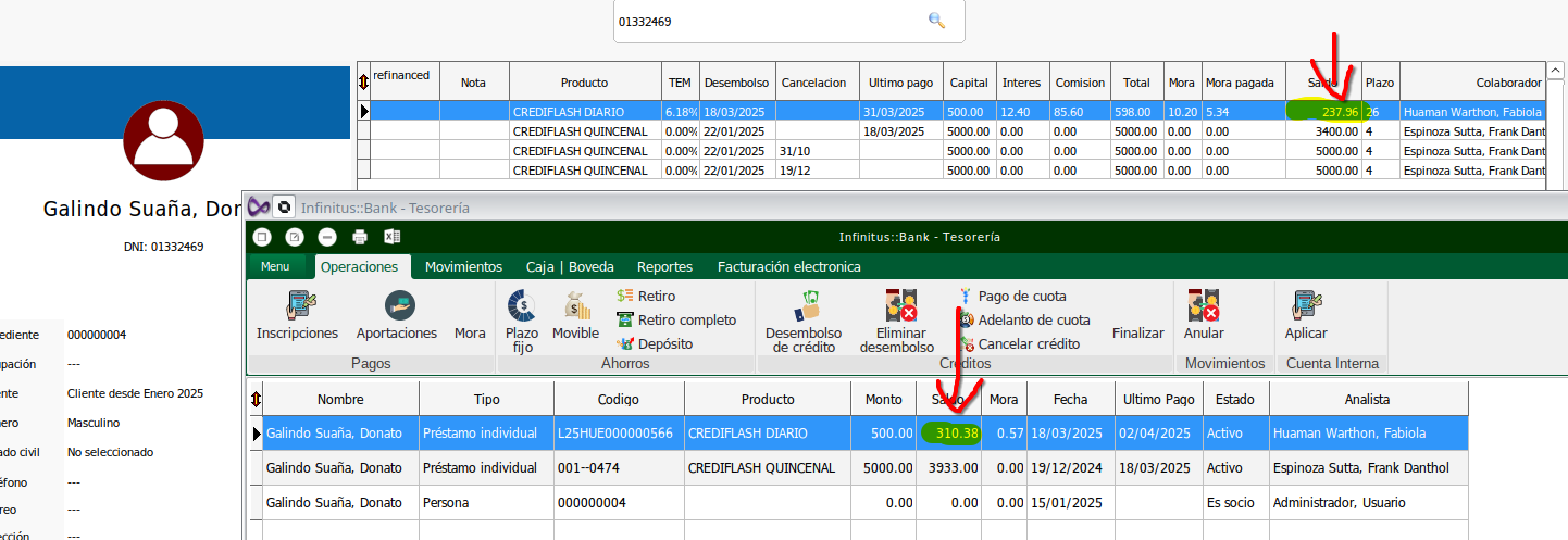 El Señor Galindo Suaña Donato con dni 01332469 en prestamo no coincide el saldo con Maestro Cliente