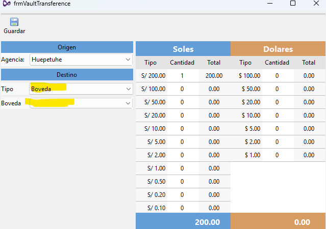 • Que cuando se ingrese a TRANSFERENCIA en boveda en la opcion destino que por defecto este en TIPO: Ventanilla y Ventanilla: Huepetuhe