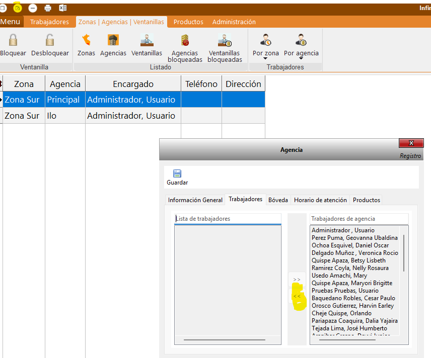 Cuando pongo editar agencia me muestra esta ventana y en la pestaña trabajadores en la parte de la derecha cuando presiono el boton izquierda me desaparece al trabajador lo correcto seria enviarlo a la ventana de la izquierda