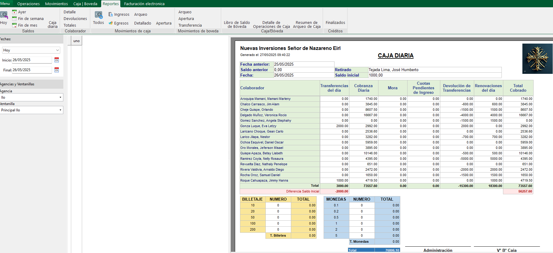 En el reporte de caja diario estan colaboradores de ILO y AREQUIPA