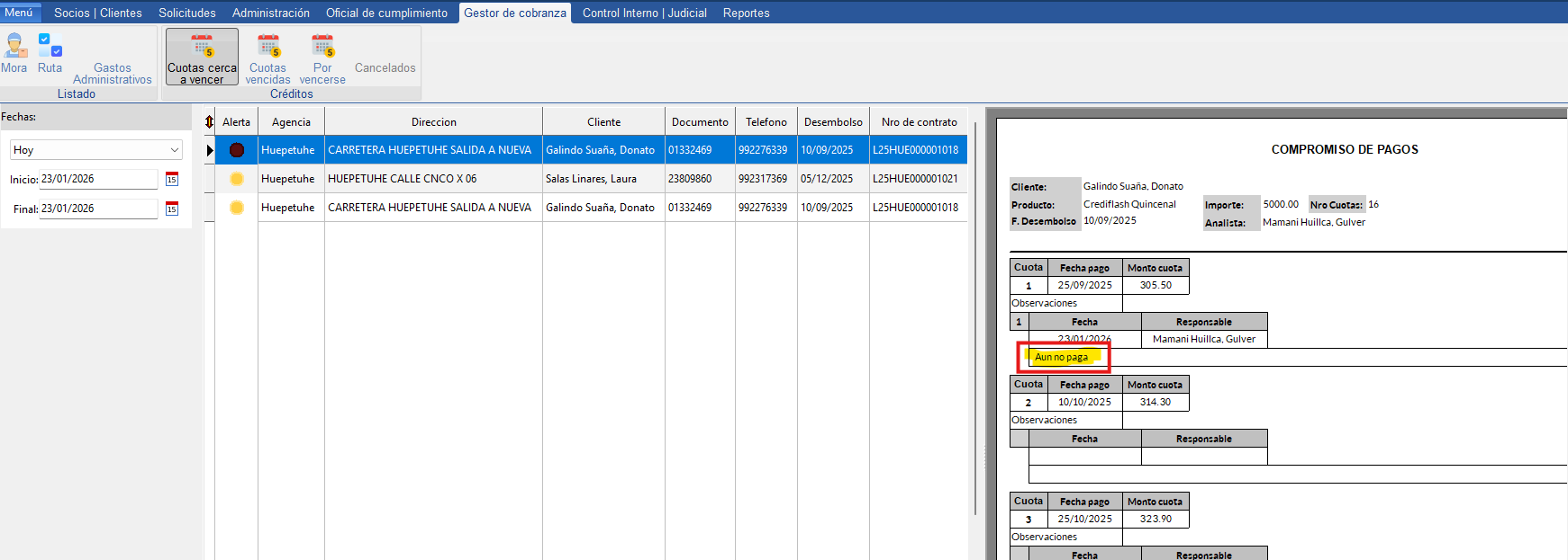 En Cuotas cerca a vencer se ingreso una observacion, se gravo y se visualiza en el LRF pero luego ingreso otra y no se visualiza